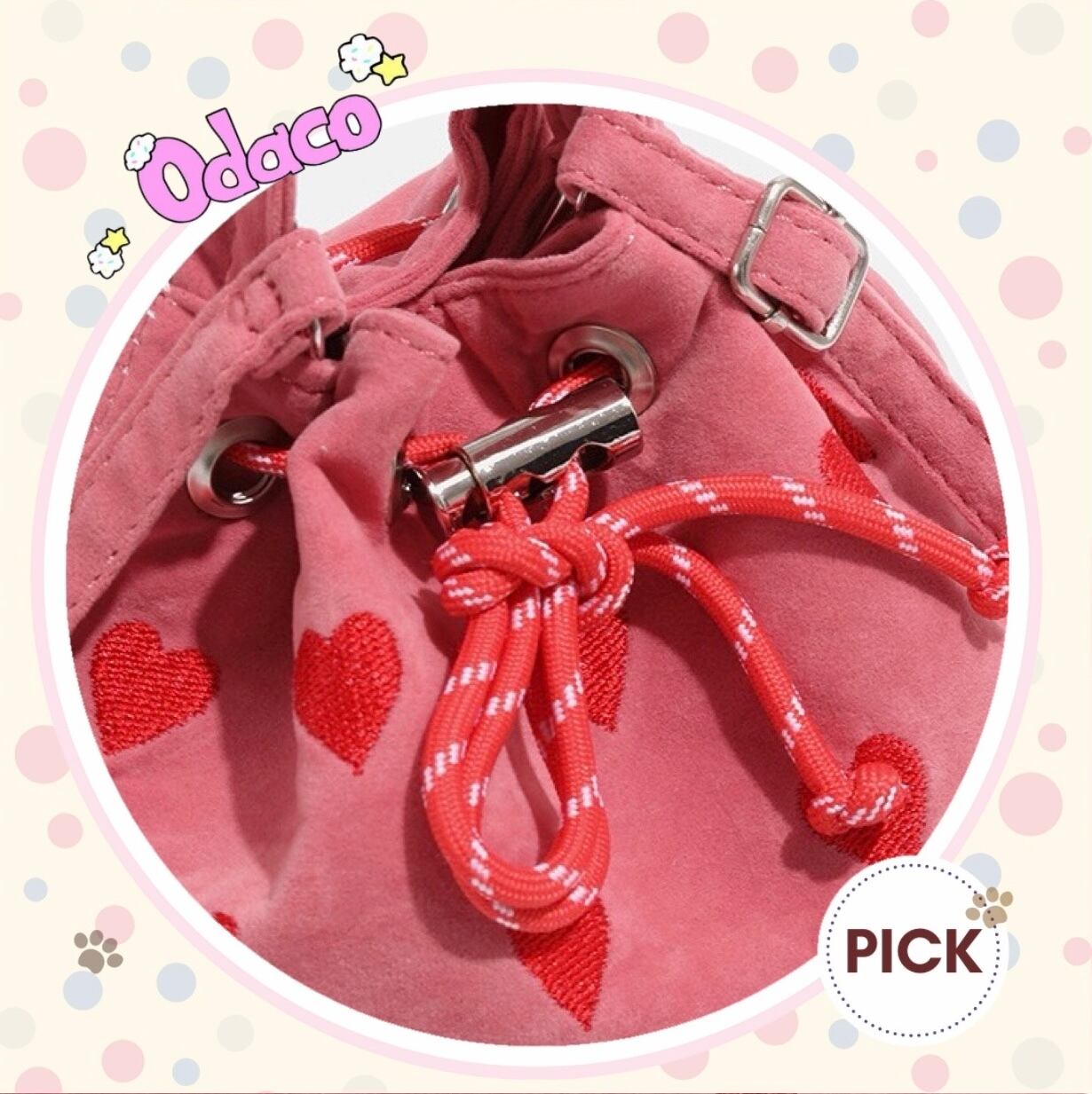 ハートいっぱいのショルダーストラップ付きの巾着バッグです。